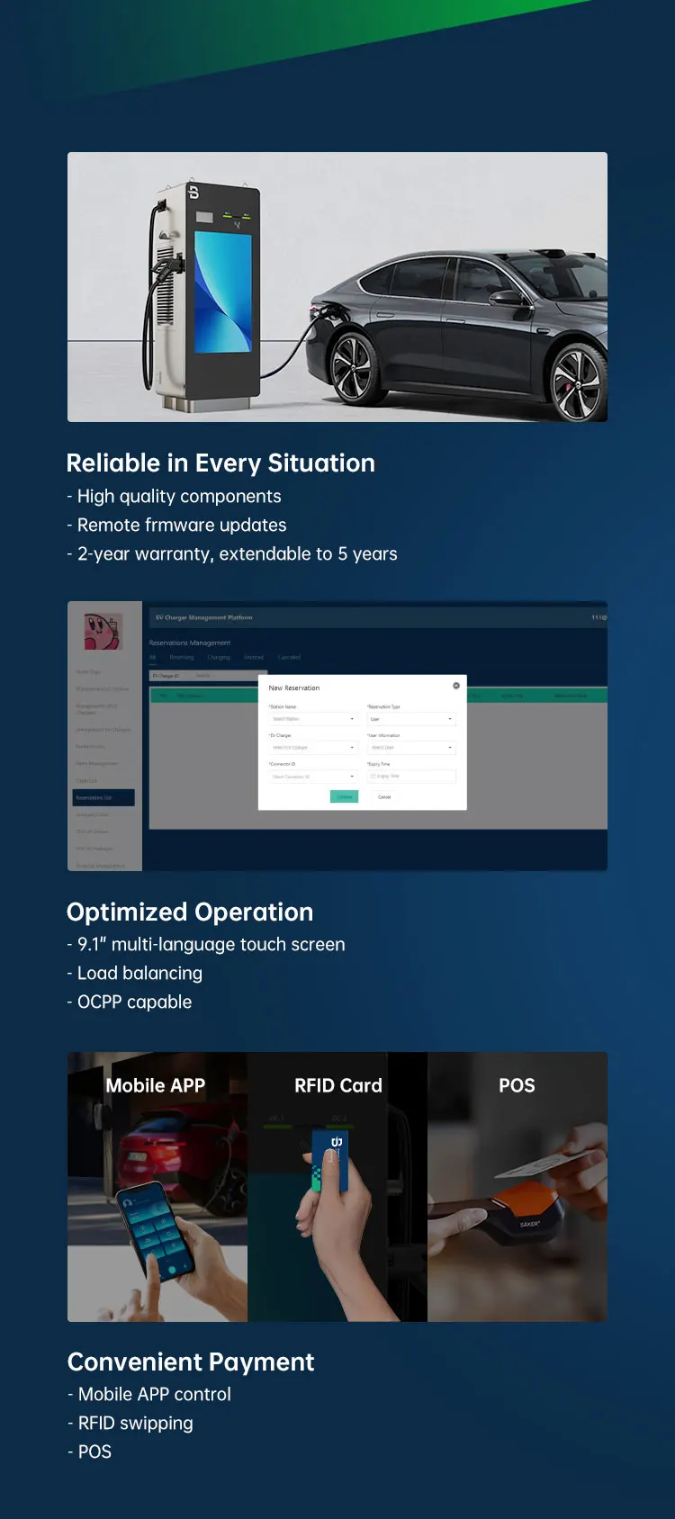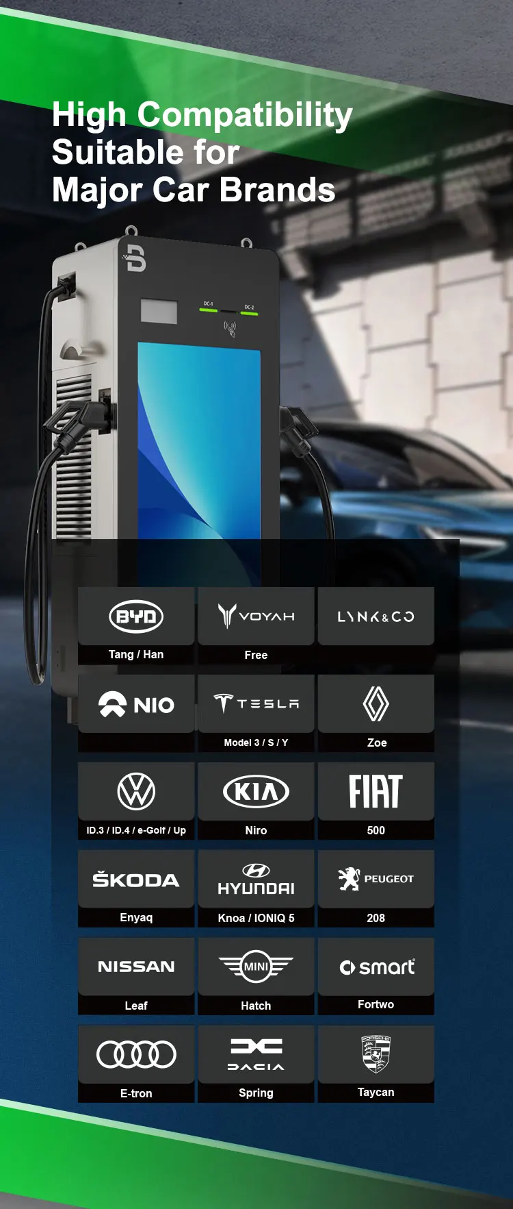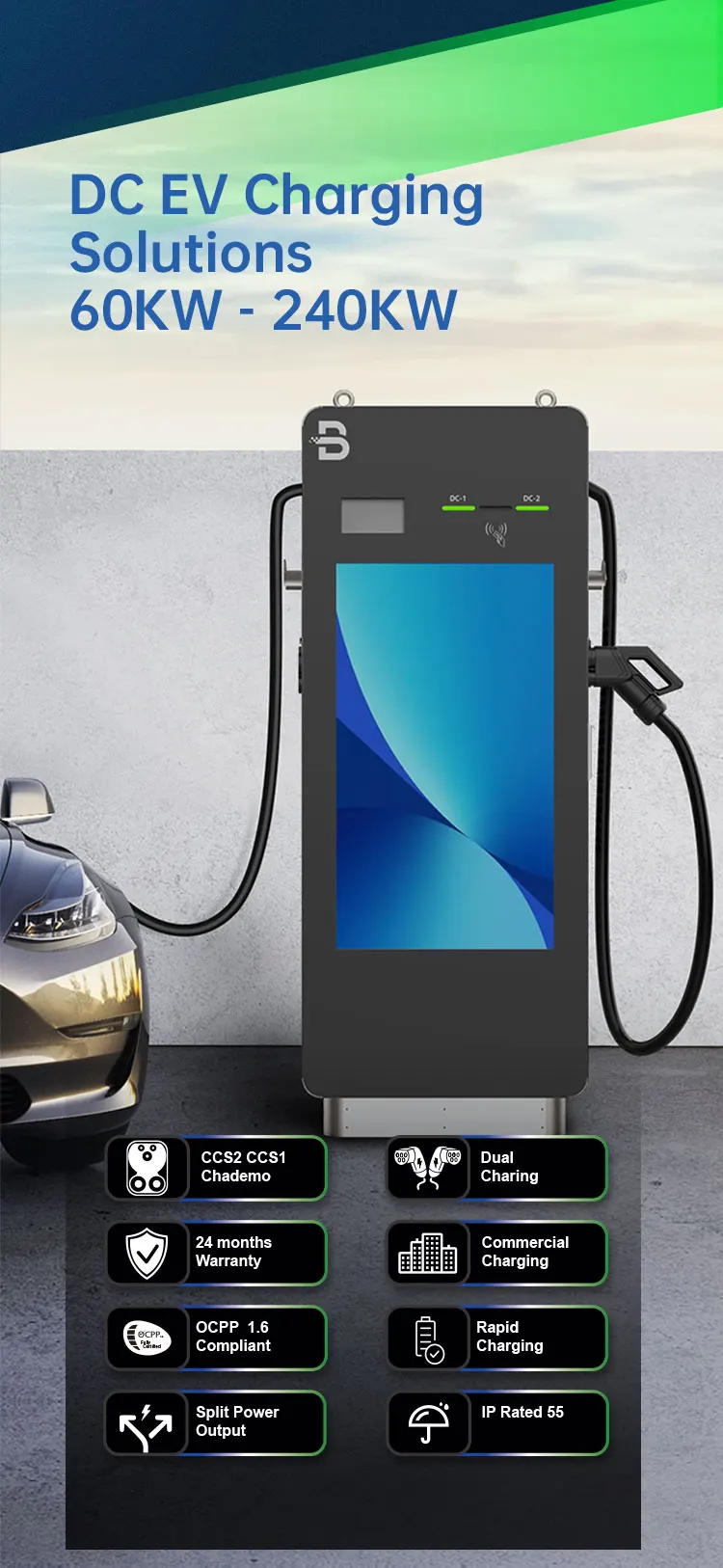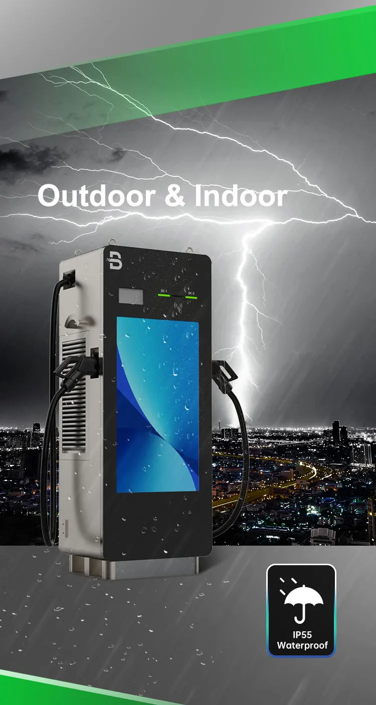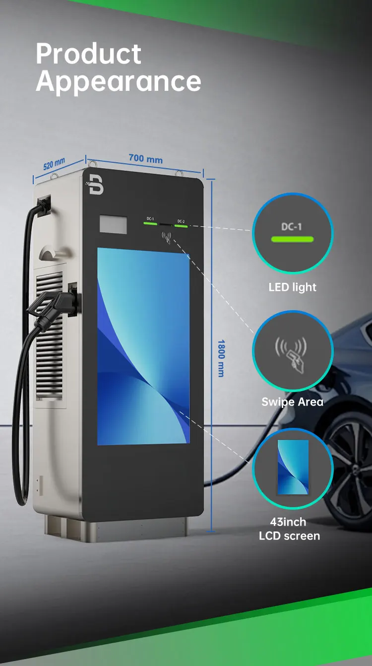 * 2 Guns ( CCS1, CCS2,Chademo,GBT Optional) * Floor-stand * 43 inch LCD screen/LED light * OCPP 1.6 * IP55 * 24 Months Warranty * Time-saving - Fast charging * Power saving - High conversion efficiency and low standby power consumption * High Safety - Dual protection to both manual operation and vehicles