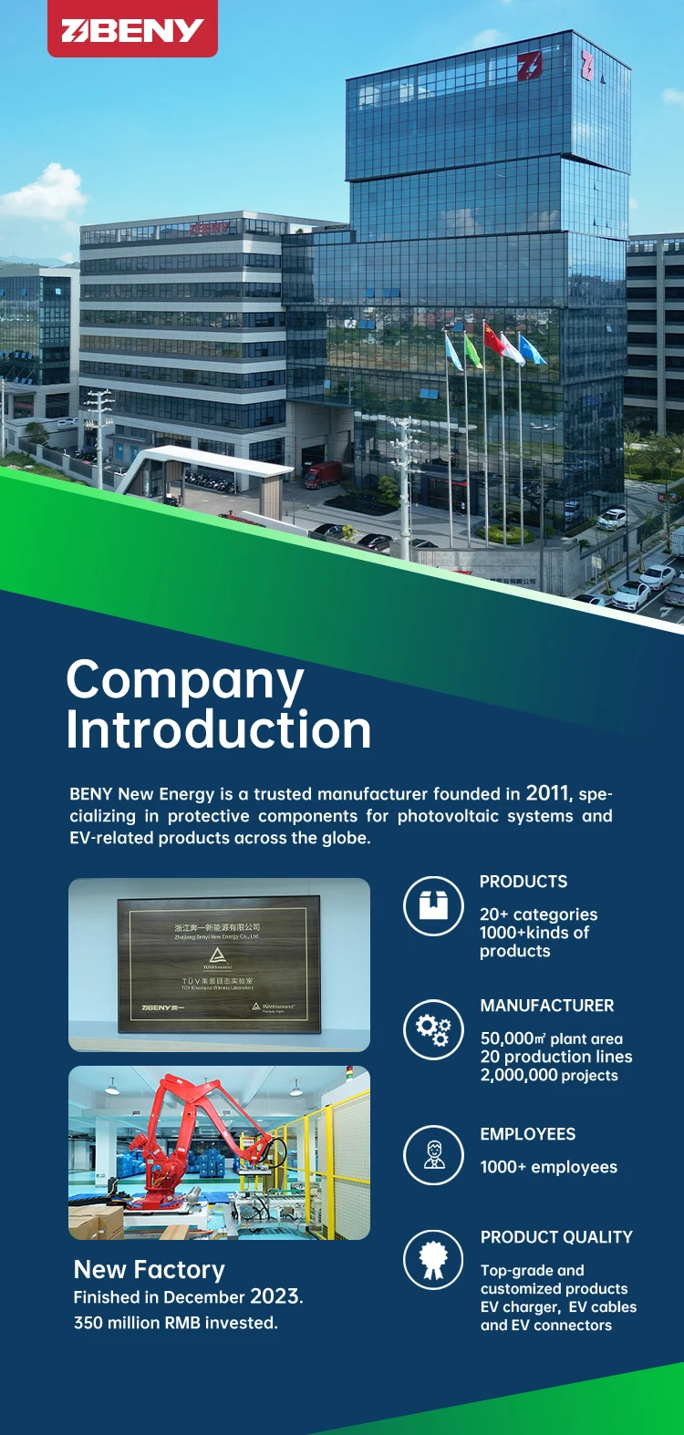 BENY is a long-running EV charger and PV products manufacturer with more than 30 years of experience. Our knowledge in manufacturing PV components ensures all of our EV chargers surpass your expectations in terms of service life and performance.